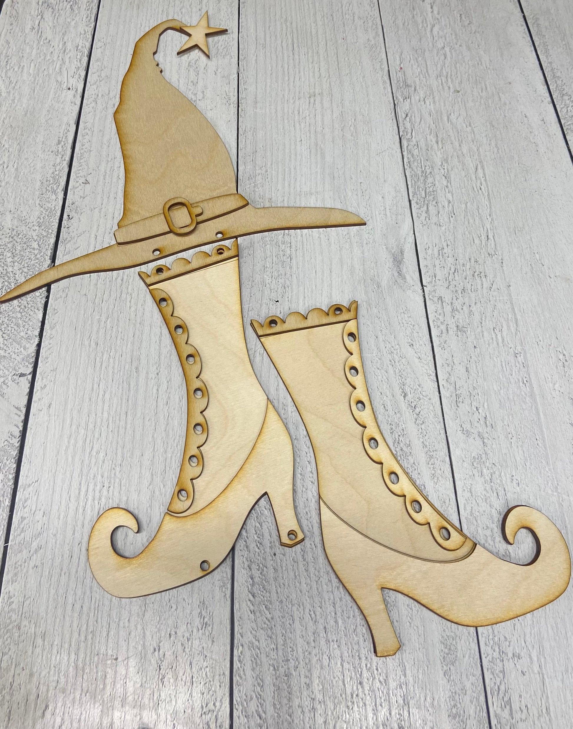 Witches Boots and Hat door hanger will be the envy of all you neighbors! This item comes unpainted and will look adorable on your door or in your home for a cute Halloween accent piece!