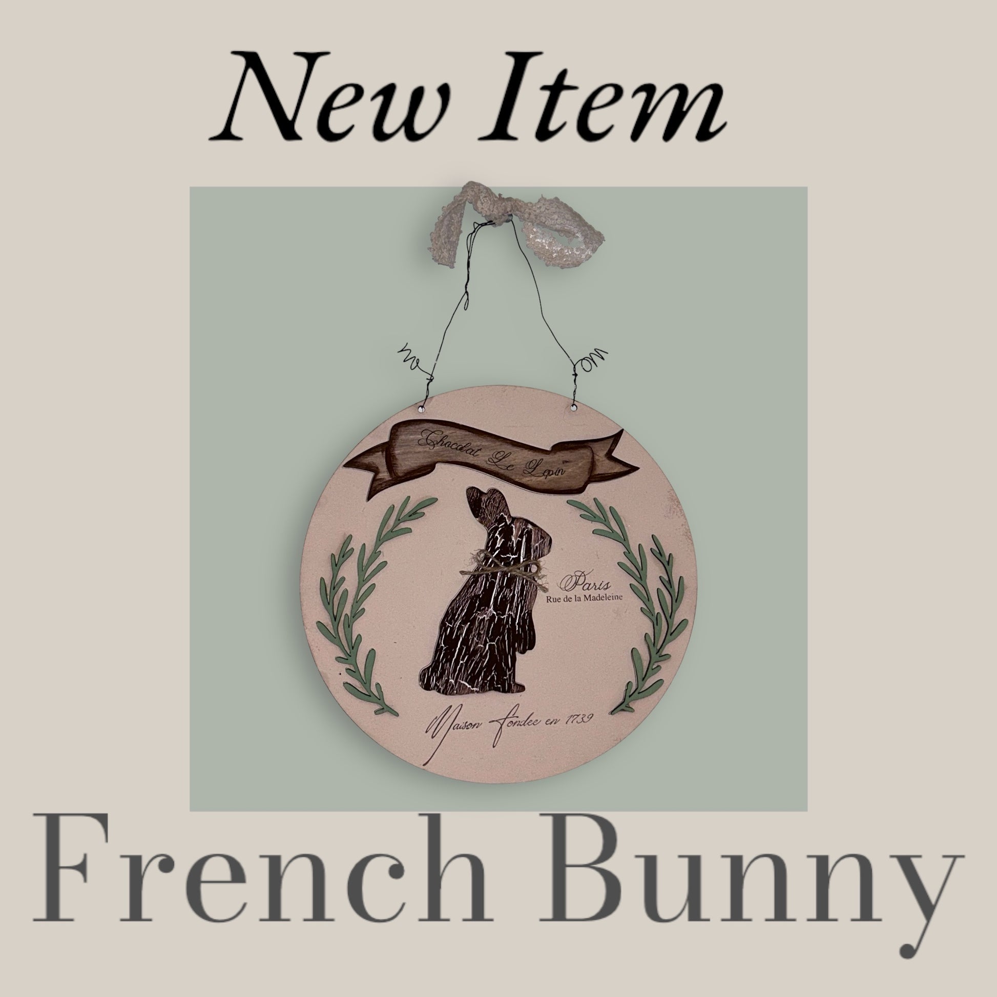 French country Inspired Chocolate Bunny Door Hanger. !0 Inround comes with everything you see here.