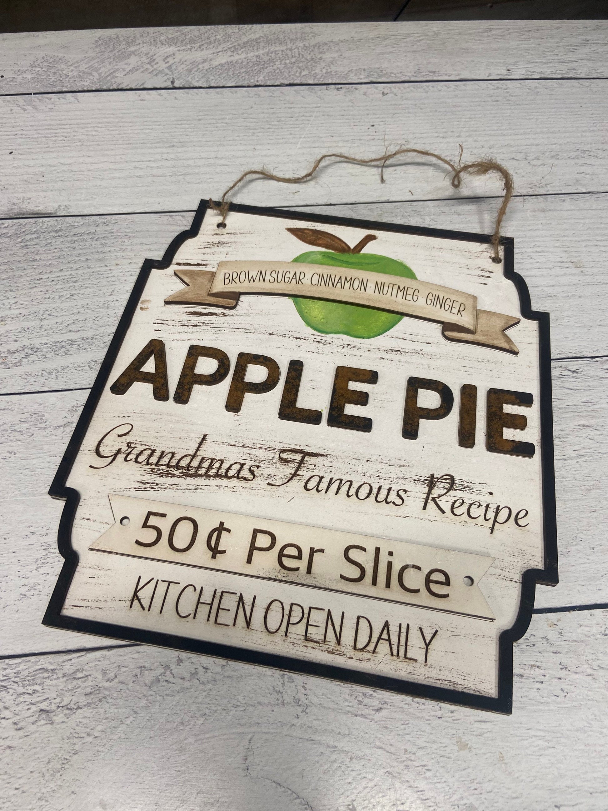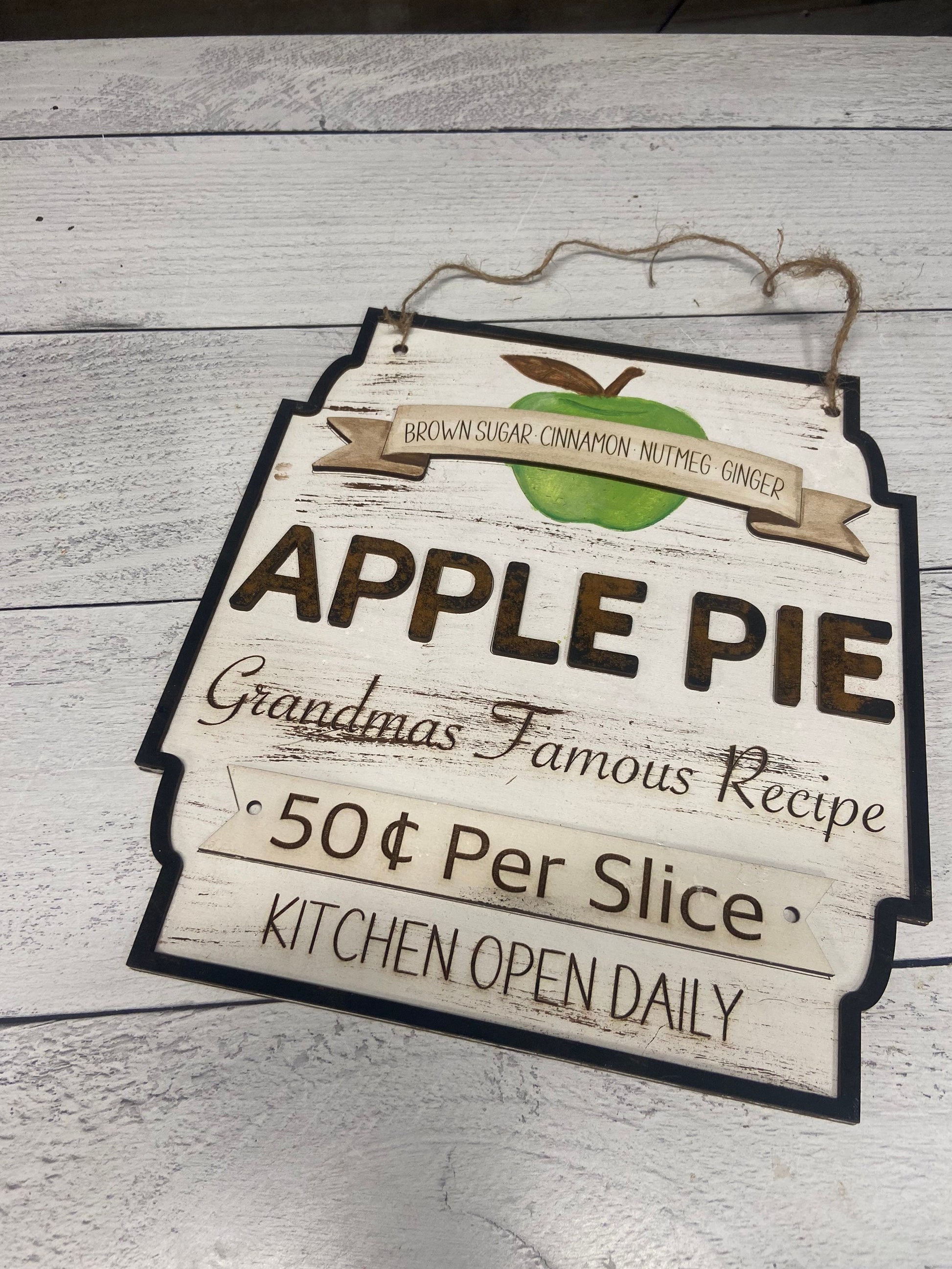 This adorable Apple pie sign will look amazing in your home, or your front door. The ingredients listed on the sign or actual ingredients from my mothers apple pie recipe. Now all you need to decide is will you paint yours red apple, green apple, or yellow apple?
