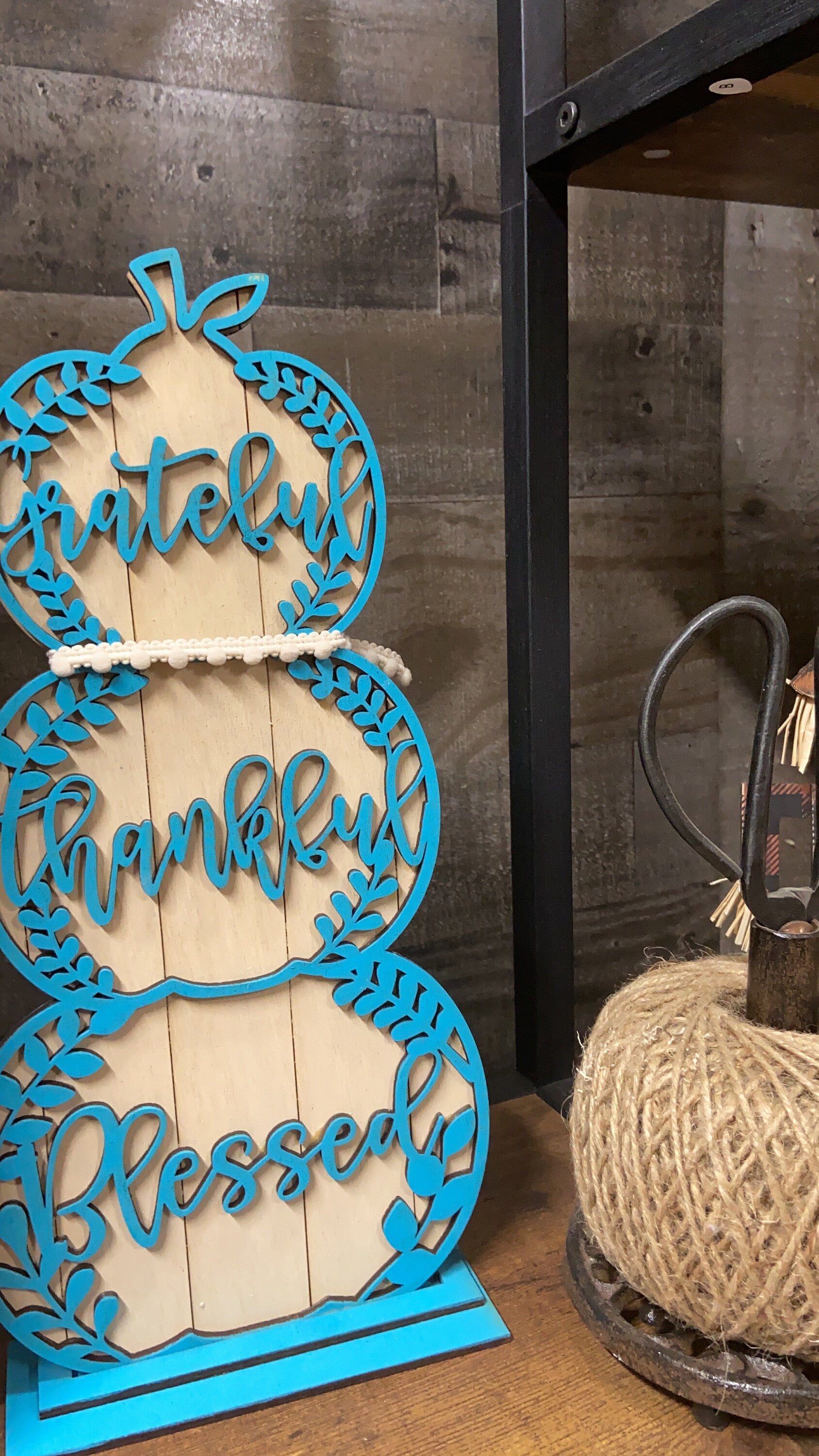 Painted Teal Thankful Grateful Blessed stacked pumpkins
