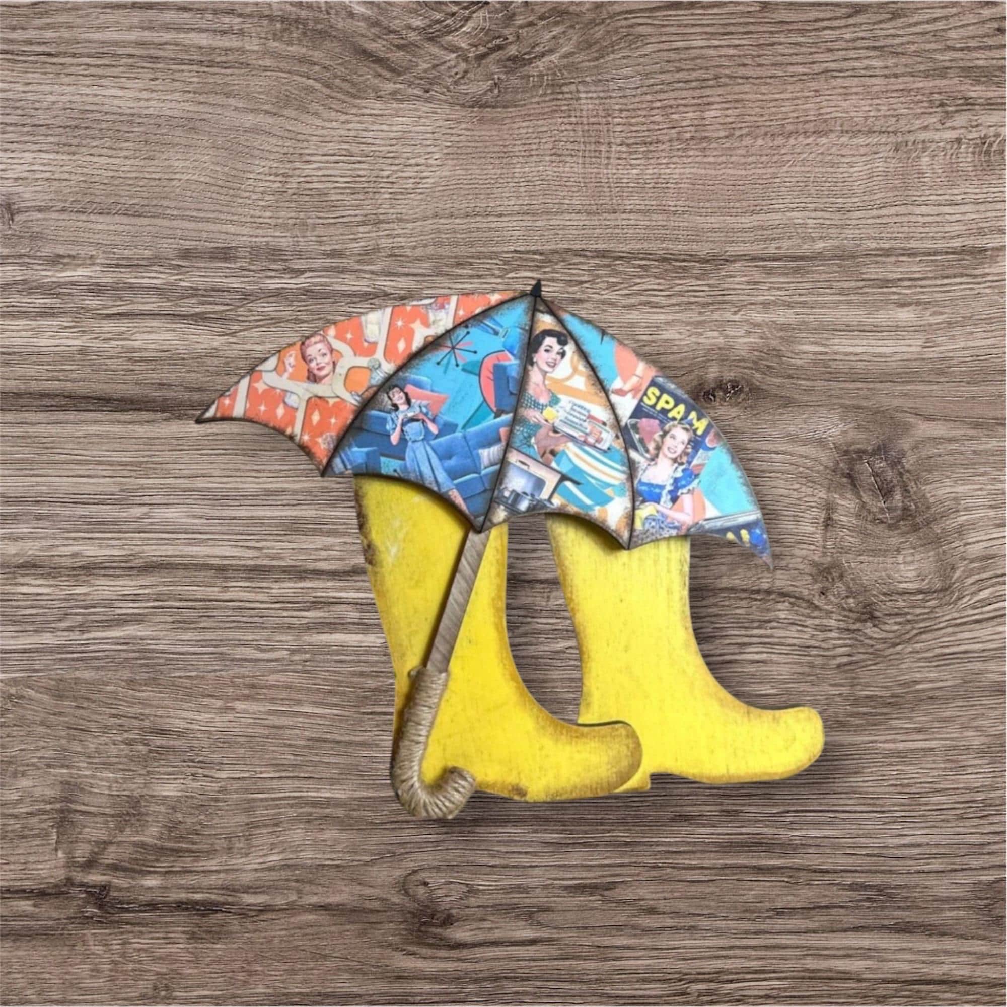 Boots are approximately 3 inches tall, umbrella is approximately 5 inches wide. these are perfect for embellishing projects or use in a junk journal!