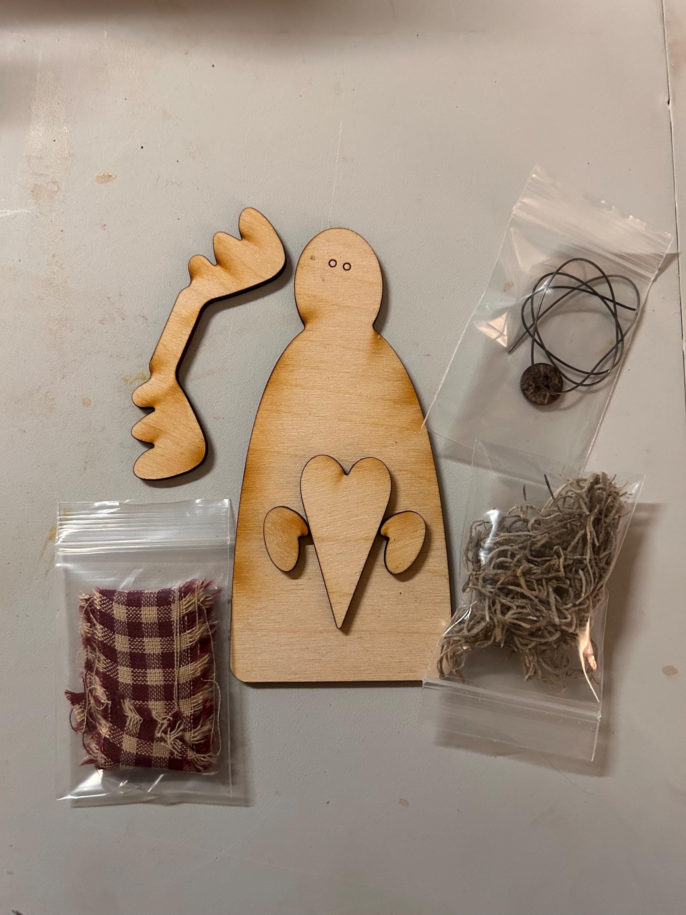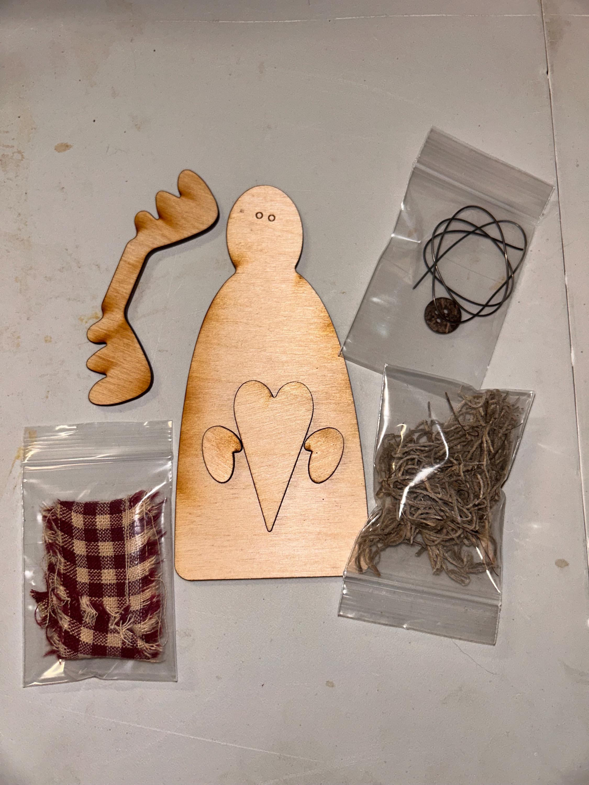 kit includes wood cutouts, wire, ribbon, button, and moss