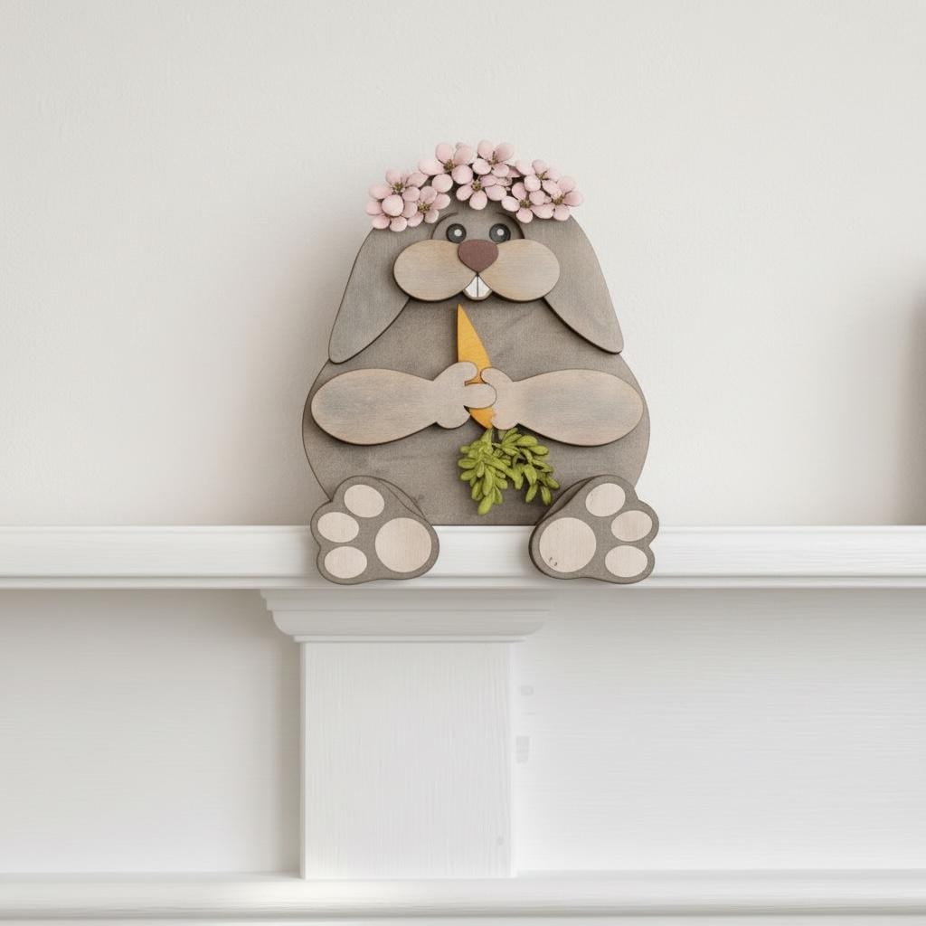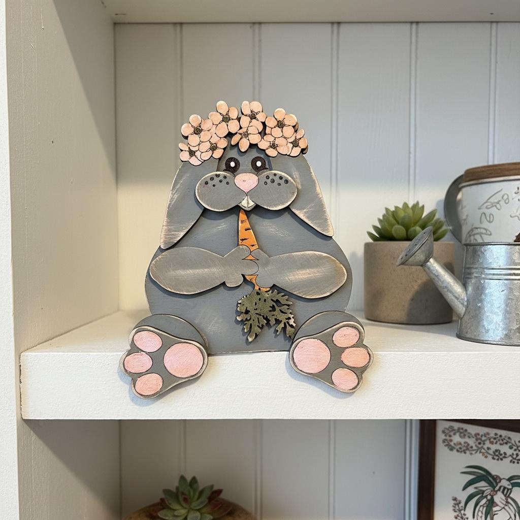Bunny Shelf Hugger is ment to sit on the edge of a shelf, windowsill, countertop or fireplace mantel! She comes UNPAINTED abs UNASSEMBLED. DIY= Do it yourself