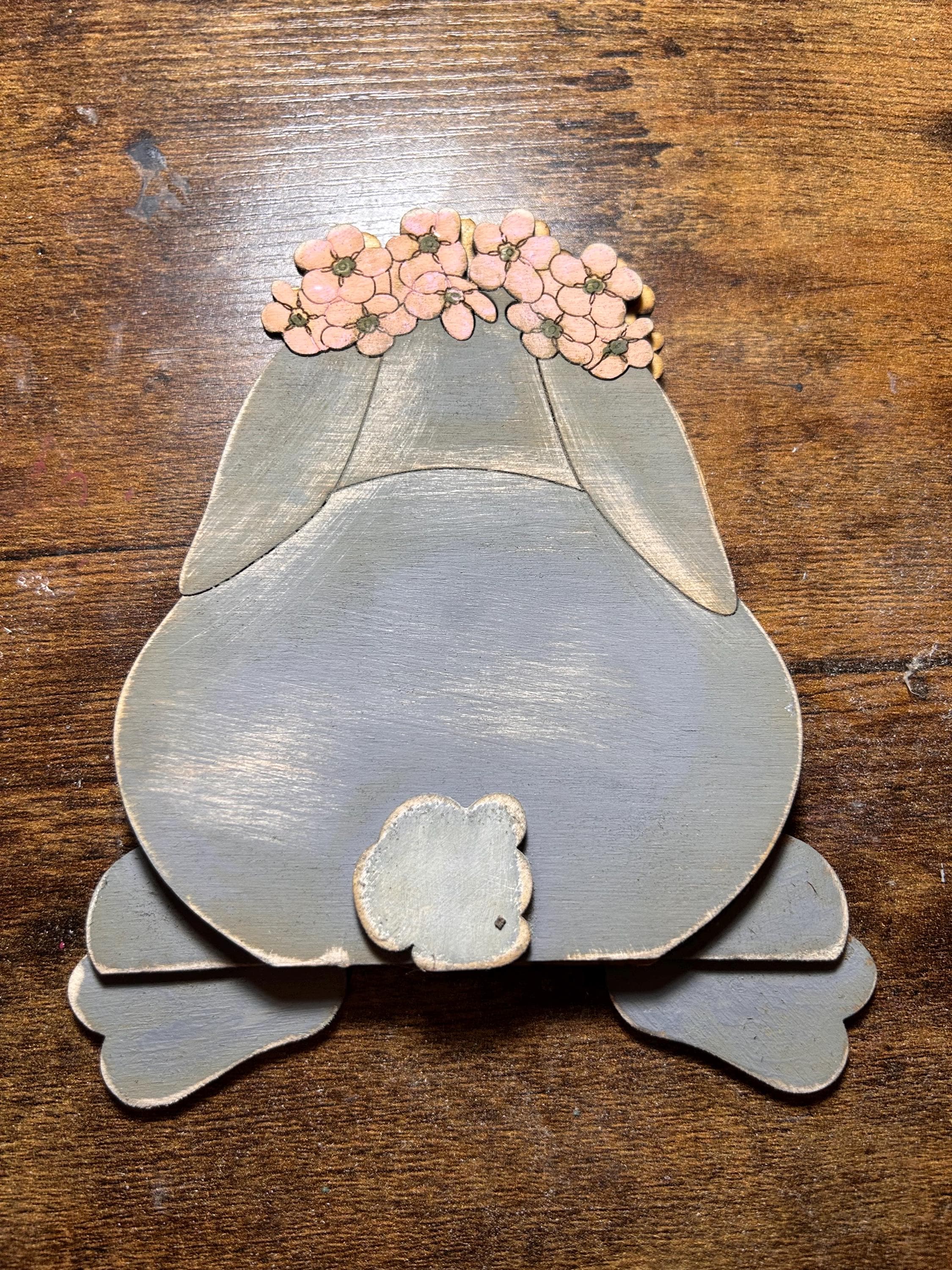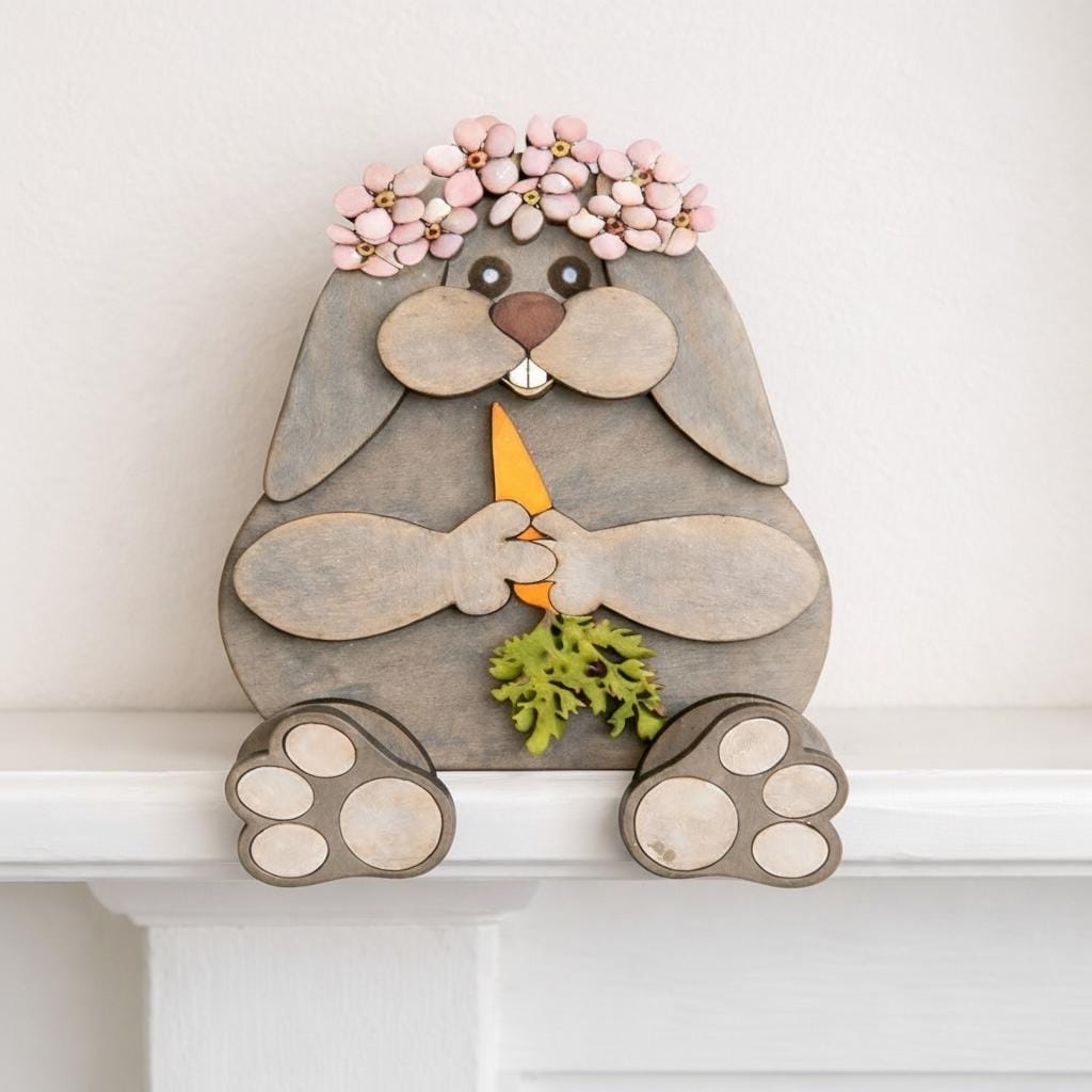This bunny comes in TWO sizes 6 inch and 8 inch tall and is meant to sit on the edge of a shelf, countertop, table, windowsill, or fireplace mantel. She comes unpainted and unassembled. DIY = DO IT YOURSELF